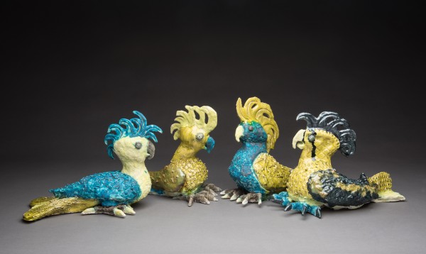 Ceramic sculptures of aristocratic Rococo Girls parading their collections of exotic and curious animals.