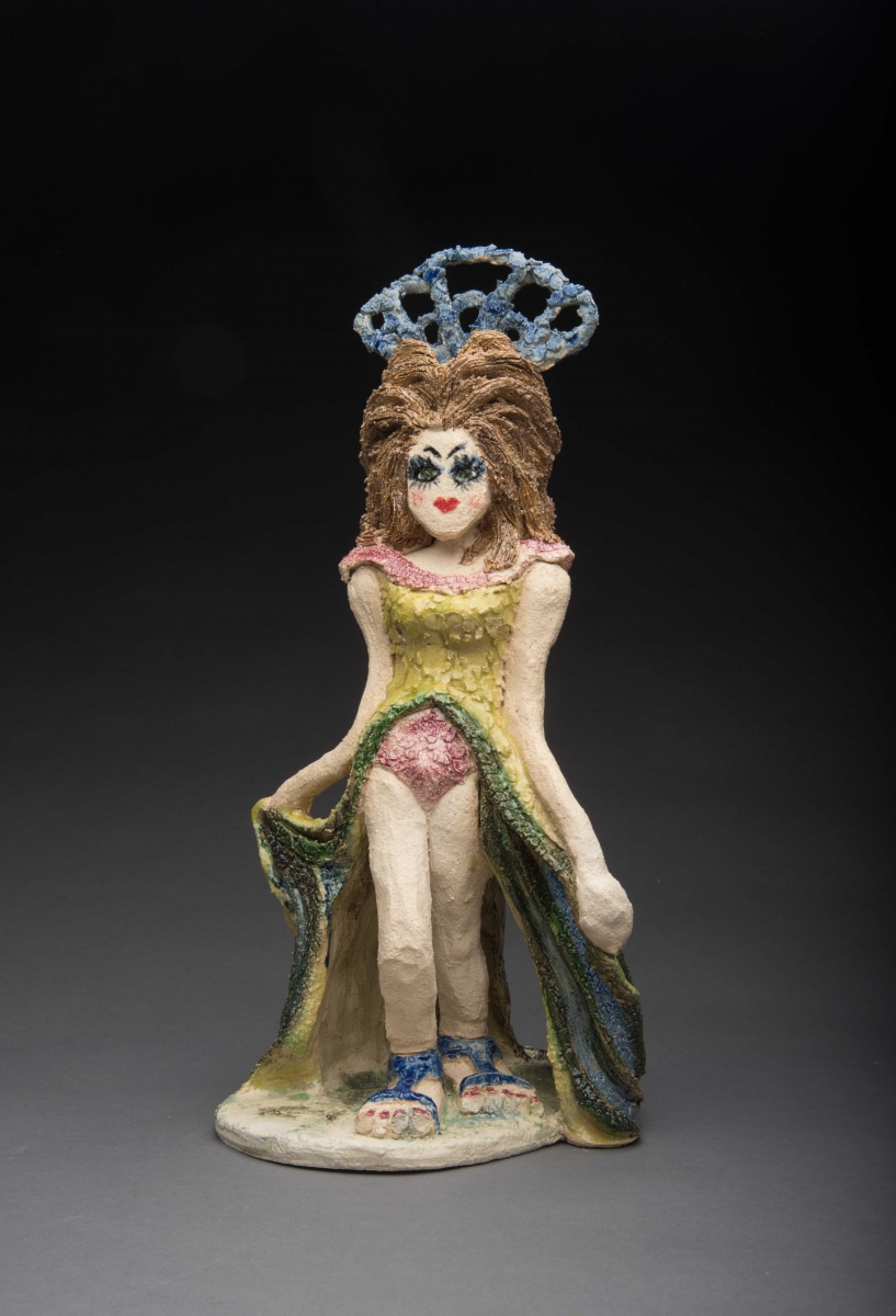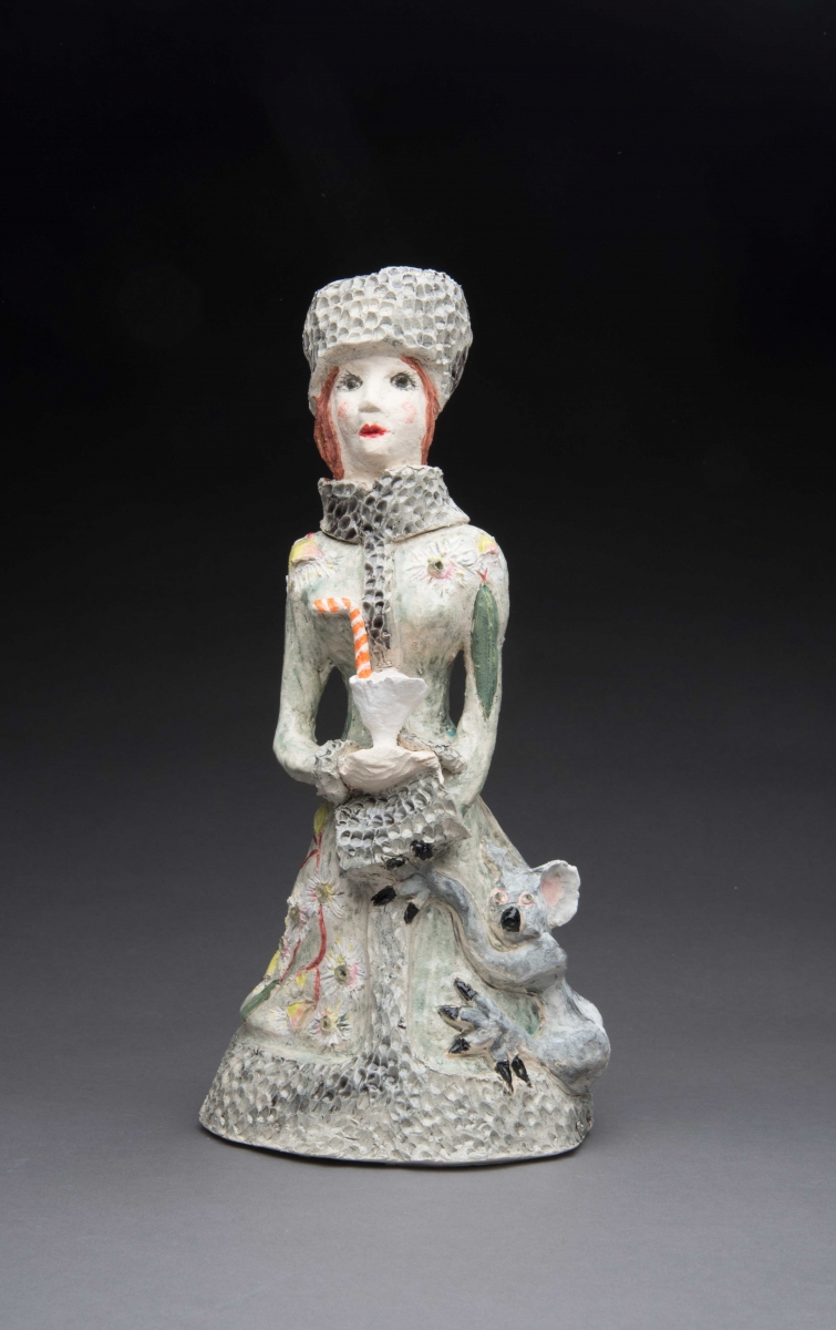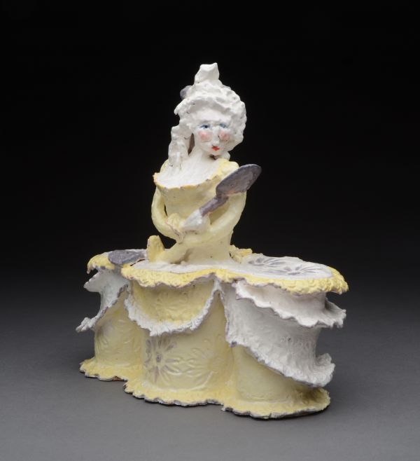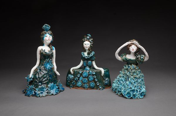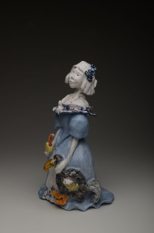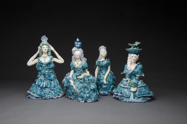 "Perhaps it is impossible to wear an identity without becoming what you pretend to be." My collection is about female identity. These imperfect vintage style figurines are modeled on Marie Antoinette and the French Rococo era in art history. The Rococo period of the 18th century was a time where art embraced the exotic. The women of the court of King Louis XVI were fashionable and extravagant. Women were defined by their dress – costumes were meticulously designed and women conscientiously paraded themselves in public. These women deliberately made choices about their appearance. Outrageous or demure, frivolous or over the top, impression was paramount. The more voluminous the skirt and elaborate the costume, the greater the pretense. In my work the dress becomes a metaphor for identity – a mask that a woman hides behind; a place where she finds comfort. But what of the woman behind this charade? Does her appearance define her reality? Quote from Orson Scottcard – "Ender's Game".