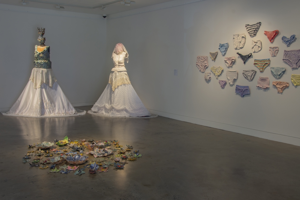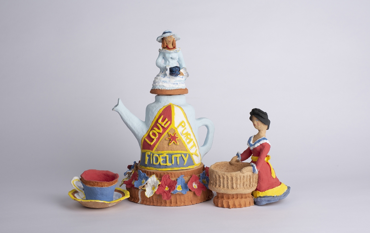 Amanda has created an installation using ceramics, found objects and performance video to tell the story of Brigid Partridge. Amanda views this story through a feminist lens and transports the past experiences of Brigid into a twenty-first century context. A series of ceramic plates use quotes from Julia Gillard, Brittany Higgins, Christine Holgate and Grace Tame give a contemporary context to the patriarchal nature of the society that Brigid experienced in post world war one Australia