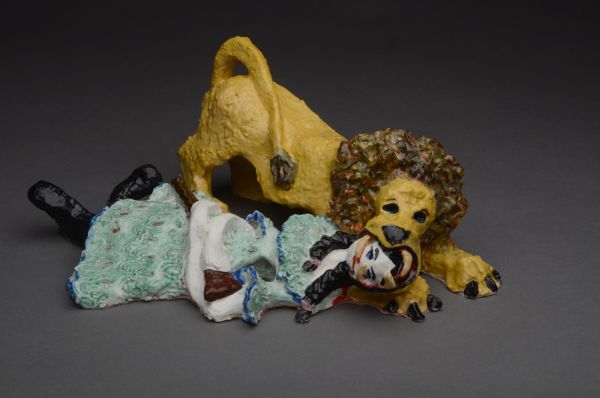 Amanda Bromfield creates figurines fashioned and referenced in history. In this work she has referenced a 1830's Staffordshire porcelain figurine titled "Death Of Munrow" by an unknown ceramist. The roles and out come are reversed in this sculpture. The lion stalks and kills the human. The lion collects the trophy, poses with the kill and twitters about this "incredible day hunting".